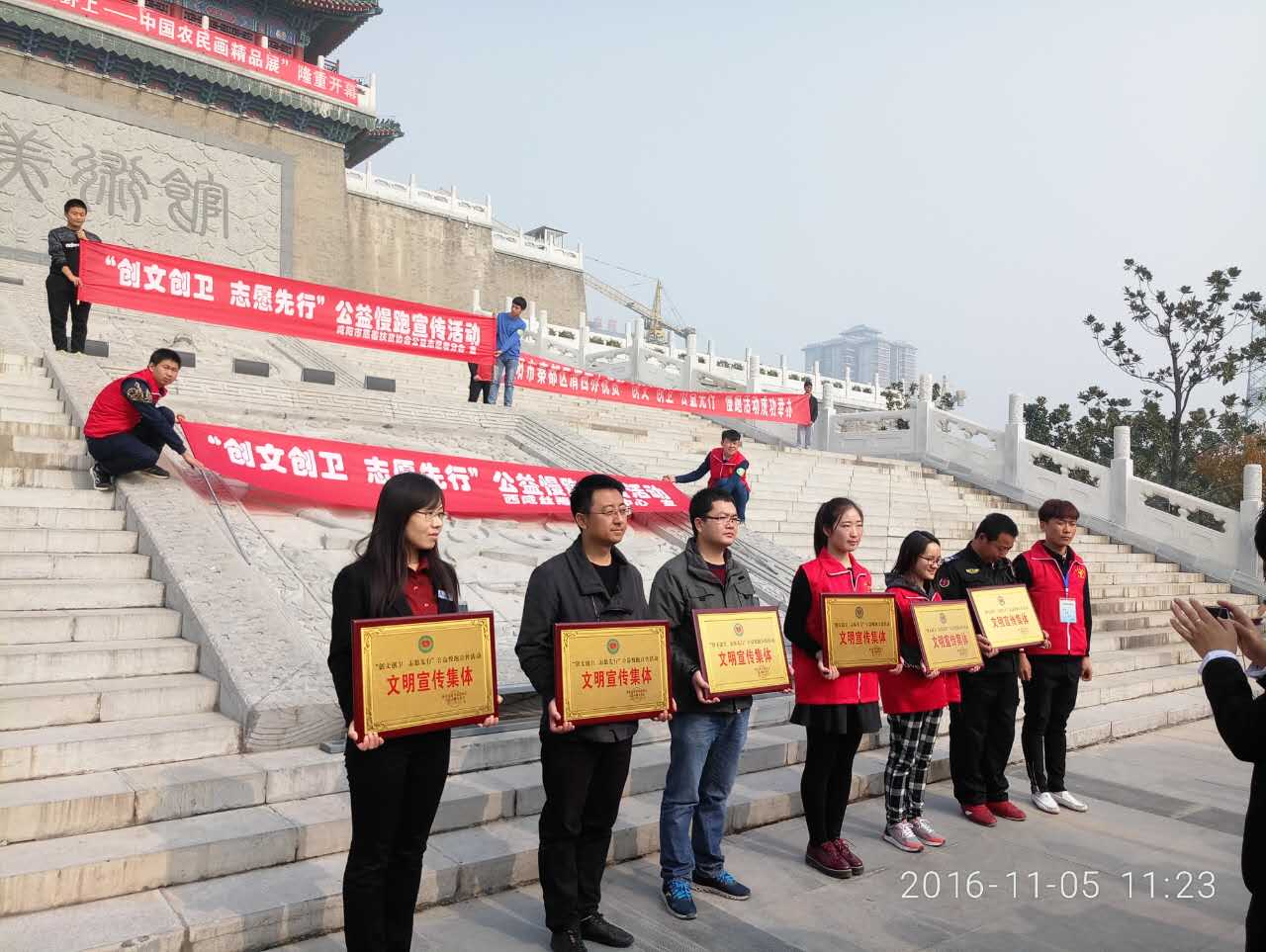 到達(dá)終點(diǎn)后,所有參與團(tuán)體于在清渭樓前集合。城投集團(tuán)志愿者服務(wù)隊(duì)代表領(lǐng)取了由咸陽(yáng)市慈善扶貧協(xié)會(huì)公益志愿者分會(huì)頒發(fā)的榮譽(yù)證書(shū),最后全體志愿者們合影留念,記錄下了這寶貴的一刻。