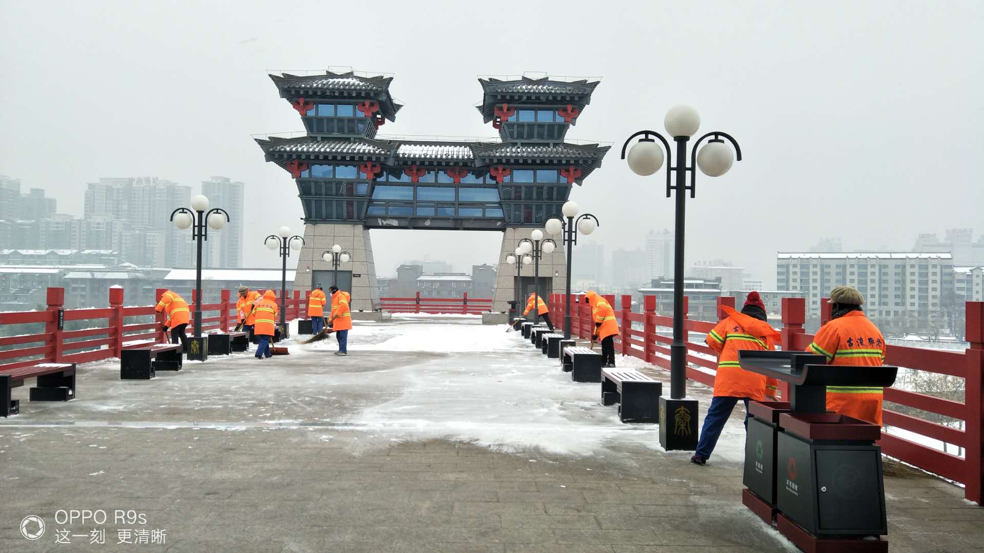 1月25日上午,為了確保道路暢通和業(yè)主的出行安全,城投物業(yè)全體員工冒著凜冽的寒風,在總經(jīng)理趙明海的帶領(lǐng)下,兵分三路,對古渡廊橋、小區(qū)主干道、包抓路段積雪進行清除。